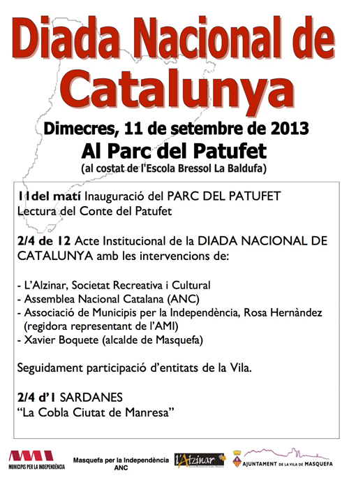 A 2/4 de 12 tindrà lloc l’acte institucional de la Diada, amb els parlaments de representants de l’Alzinar, Societat Recreativa i Cultural, l’Assemblea Nacional Catalana, la regidora representant de l’Associació de Municipis per la Independència Rosa Hernàndez, i l’alcalde de Masquefa, Xavier Boquete.