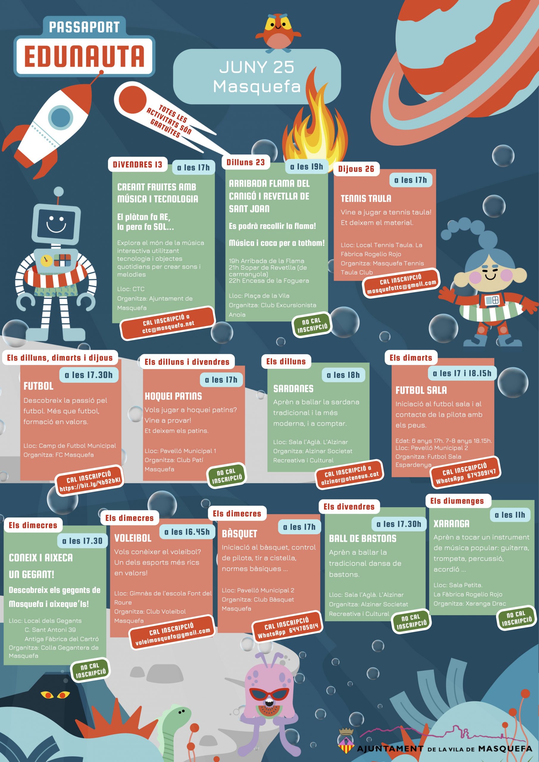 Tallers setmanals, esports, música i tradicions omplen l’agenda del Passaport Edunauta L’Ajuntament de Masquefa presenta una nova edició del Passaport Edunauta per a infants aquest mes de juny. Una proposta lúdica i formativa que omple els dies lectius i els caps de setmana amb opcions esportives, musicals, culturals i tecnològiques. Totes les activitats són gratuïtes i…