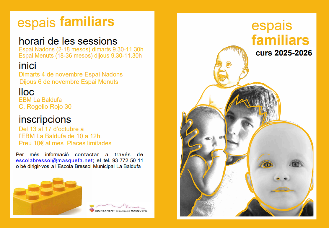Una proposta educativa i de suport a la criança per a famílies amb infants de 2 a 36 mesos Del 13 al 17 d’octubre de 10 a 12 h, a l’Escola Bressol Municipal La Baldufa, estaran obertes les inscripcions als Espais Familiars del curs 2025-2026, una iniciativa adreçada a famílies amb infants d’entre 2 i…