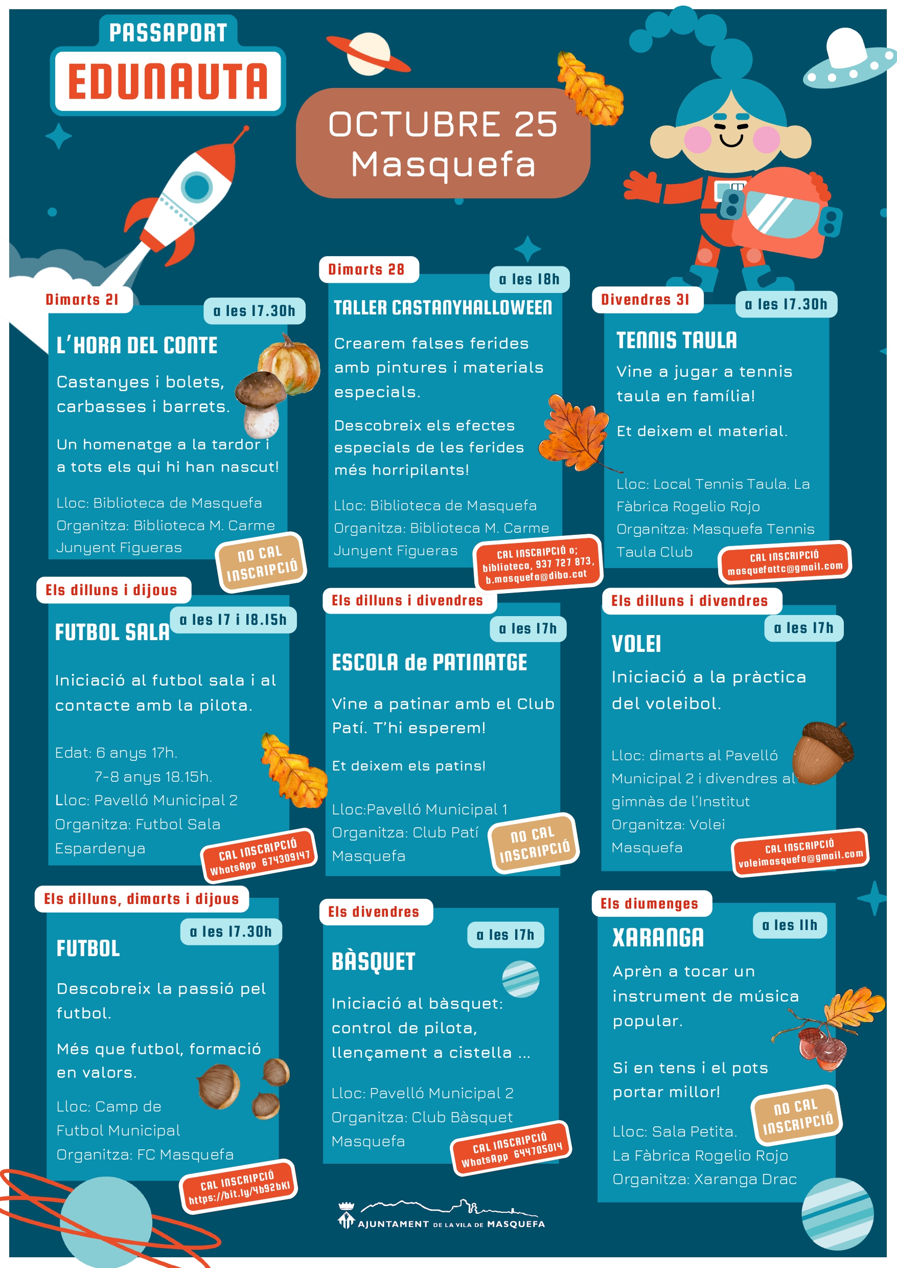 Esports, música, manualitats i festes populars omplen de propostes Masquefa Aquest octubre comença un nou viatge amb el Passaport Edunauta. La presentació es va fer als alumnes de 1r i 2n en un acte a la Sala Polivalent divendres 17. Aquest serà el segon curs que el Passaport fomentarà que els infants especialment de 1r…