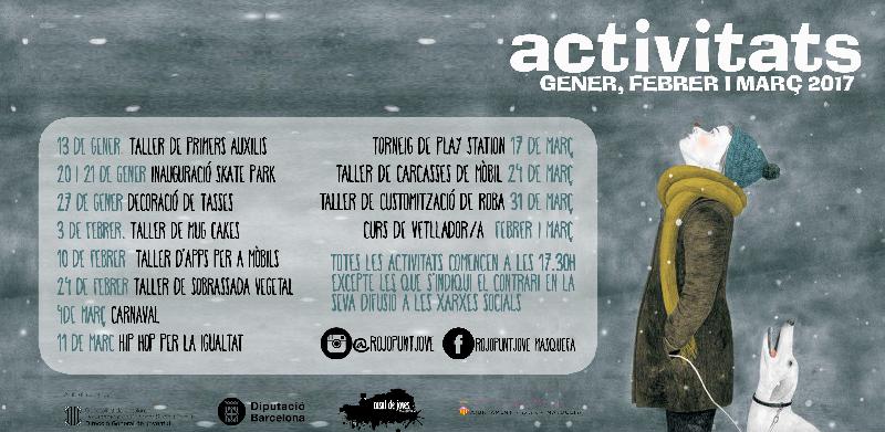 Al llarg del primer trimestre de l’any 2017, l’Ajuntament i la comissió de joves KSJ Masquefa aniran novament de la mà per oferir als joves masquefins diverses propostes lúdiques i culturals: un taller de primers auxilis (13 de gener), taller d’elaboració de mug cakes, tasses decorades (27 de gener i 3 de febrer); taller de creació d’APP’s (10 de febrer); taller de cuina (24 de febrer); Festa de Carnaval (4 de març); jornades de Hip-Hop per la Igualtat (11 de març); torneig de Play Station (17 de març); taller de carcasses de mòbil (24 de març); taller de customització de roba (31 de març); o un curs de 20 hores vetllador/a escolar entre els mesos de febrer i març.
