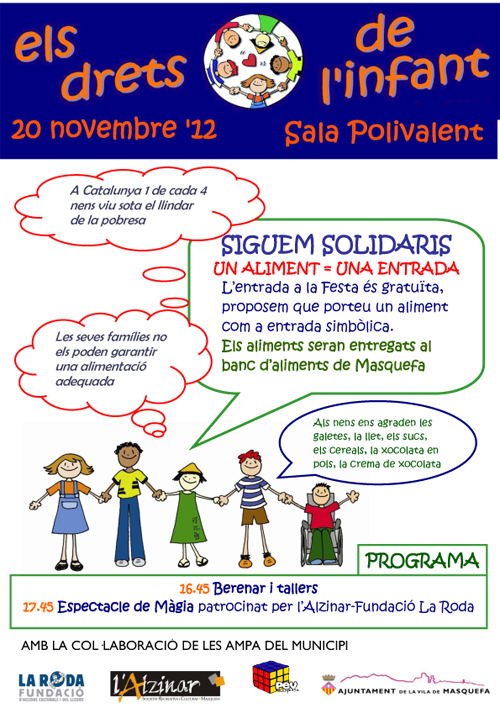 La festa del Dia Universal dels Drets de l’Infant l’organitzen, en el marc del Projecte Educatiu de Vila (PEV), l’Ajuntament, la Fundació La Roda i l’Alzinar. També hi col·laboren les Associacions de Mares i Pares dels centres educatius del municipi.