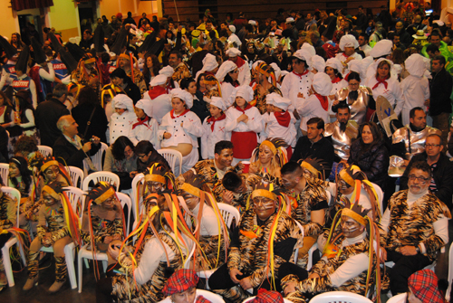 Després de posar el poble cap per avall, la rua va desembocar a La Fàbrica Rogelio Rojo, on van tenir lloc la primera festa de disfresses i l’esperat lliurament dels premis dels concurs de comparses i comerços. L’originalitat dels grups participants i l’elaborat disseny de les carrosses –es notava que portaven dies preparant-les- va fer molt difícil l’elecció del jurat. Finalment, en la categoria de més de 20 integrants, el primer premi va ser per als cuiners de MK Chefs, mentre que els lleons de Katumba es van emportar el segon guardó. En la categoria de menys de 20 integrants, els guanyadors van ser els tubs de cola Los Tite, i els quixots de Les pim pam van ser reconeguts amb el segon guardó. En totes dues categories el primer premi estava dotat amb 150 euros, i el segon amb 100.