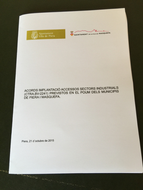 Aquest dimecres al migdia l’alcalde de Piera, Jordi Madrid, i l’alcalde de Masquefa, Xavier Boquete, han signat un acord per la construcció de dues rotondes a la carretera BV-2441 que tenen com a objectiu facilitar els accessos a les zones industrials d’ambdós municipis.