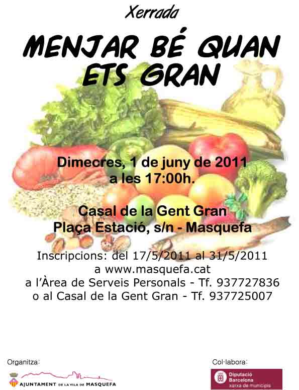 La conferència l’organitza l’Ajuntament de Masquefa amb la col•laboració de la Diputació de Barcelona i s’adreça a la gent gran. L’objectiu és donar-los informació per a que puguin practicar una alimentació saludable. S’hi tractaran continguts com ara les necessitats nutricionals, l’alimentació saludable i l’activitat física, la cuina sana, creativa i econòmica i les dietes per a problemes habituals.