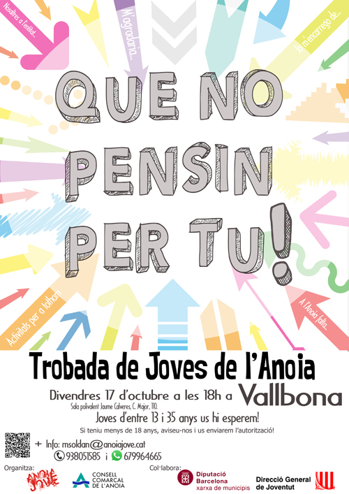 Amb el lema ‘Que no pensin per tu’ el Servei Comarcal de Joventut del Consell Comarcal de l’Anoia ha organitzat la primera Trobada de Joves de l’Anoia. Aquesta iniciativa s’adreça a joves entres 13 i 35 anys i vol ser un espai de reflexió i debat sobre diferents temes que són del seu interès. Al mateix temps, pretén fomentar que els joves s’impliquin, de manera continuada, en el disseny, la planificació i el desenvolupament de polítiques, programes i serveis de Joventut a la comarca, creant un nou canal de participació directe i permanent.