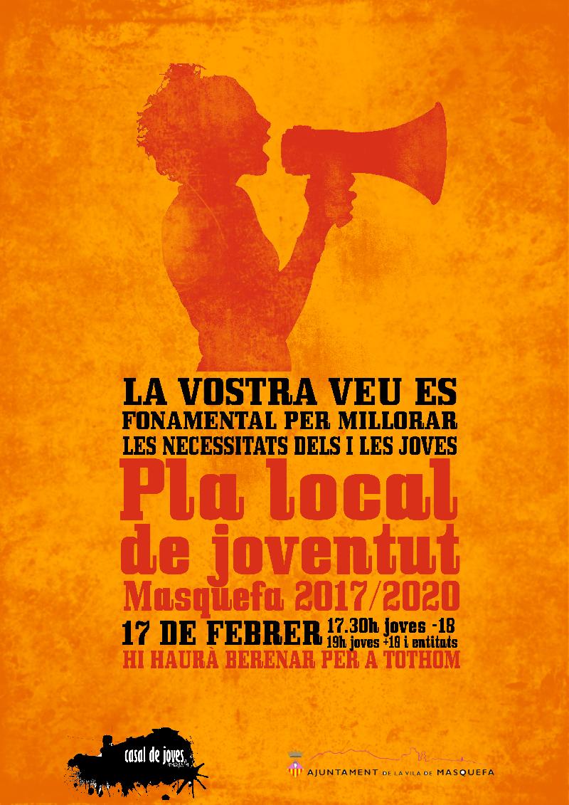 El Pla Local de Joventut consta d’un anàlisi sobre l’estat de la joventut a Masquefa atenent tant a les seves mancances com a les seves necessitats, així com també exposa els objectius a assolir i els eixos i les accions que es duran a terme per assolir els objectius que s’hi marcaran. Té una vigència de quatre anys i ha de servir per planificar i estructurar a curt i mig termini les polítiques i accions de joventut del nostre municipi.