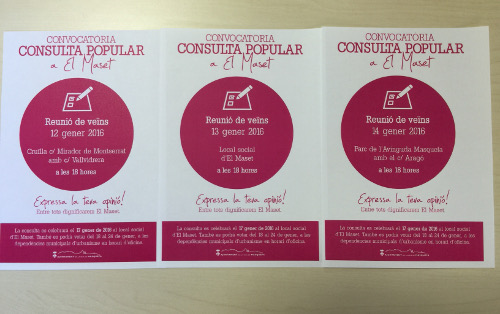 La consulta se celebrarà aquest diumenge, 17 de gener al local social d’El Maset. També es podrà votar del 18 al 22 de gener, a les dependències municipals d’urbanisme en horari d’oficina (de dilluns a divendres de 9 a 14 h i per la tarda, dilluns de 17 h a 19 h).