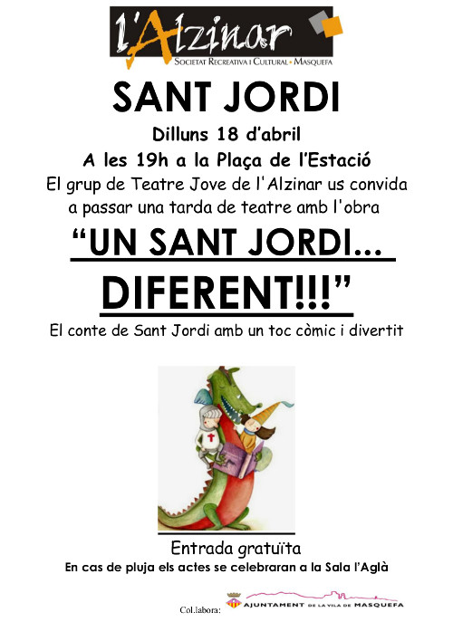 El grup de Teatre Jove de l’Alzinar us convida a passar una tarda de teatre amb l’obra ‘Un Sant Jordi…diferent!’. Podreu conèixer el conte de Sant Jordi amb un toc còmic i divertit.