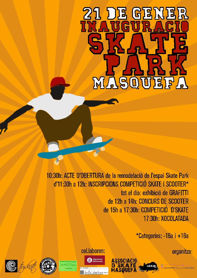 Dissabte 21 de gener la Regidoria de Joventut i la comissió "Skate Masquefa" organitzen una jornada lúdica amb exhibicions, concursos i competicions de patinatge per inaugurar l’equipament després de les millores que hi ha dut a terme el consistori.