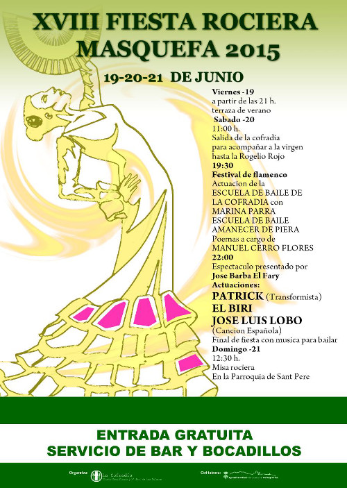 La Cofradía del Cristo Crucificado y Nuestra Señora de los Dolores celebrarà aquest divendres, dissabte i diumenge (19, 20 i 21 de juny) una nova edició de la Festa del Rocío. La celebració, que cada any destaca per la seva elevada afluència de públic, compta ja amb una gran tradició a Masquefa. Aquest any arriba a la divuitena edició. Com ja és habitual, la gran majoria de les activitats tornaran a tenir com a escenari el recinte de La Fàbrica Rogelio Rojo.