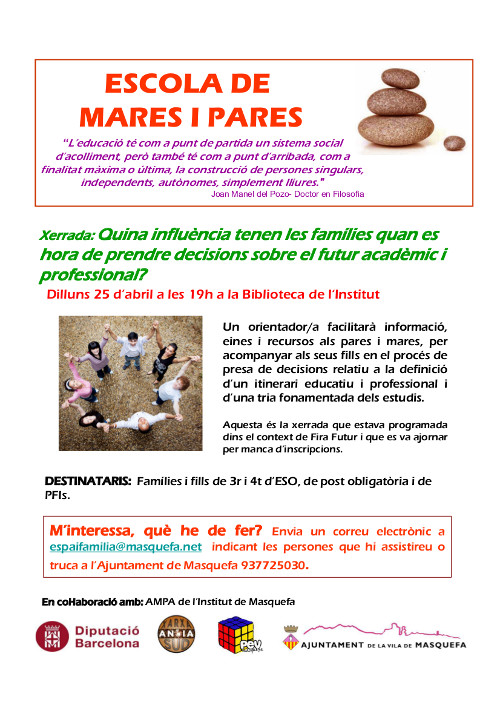L’Institut i l’Ajuntament, amb el suport de la Diputació de Barcelona, han programat pel proper dilluns 25 d’abril a les 19 h a la biblioteca de l’Institut, una xerrada sobre la influència que tenen les famílies en els fills quan és hora de prendre decisions sobre el seu futur acadèmic i professional. Aquesta trobada s’adreça principalment a famílies, que poden venir acompanyades dels fills, de 3r i 4t d’ESO. També pot ser interessant per a famílies amb fills en estudis post obligatoris i PFIs.