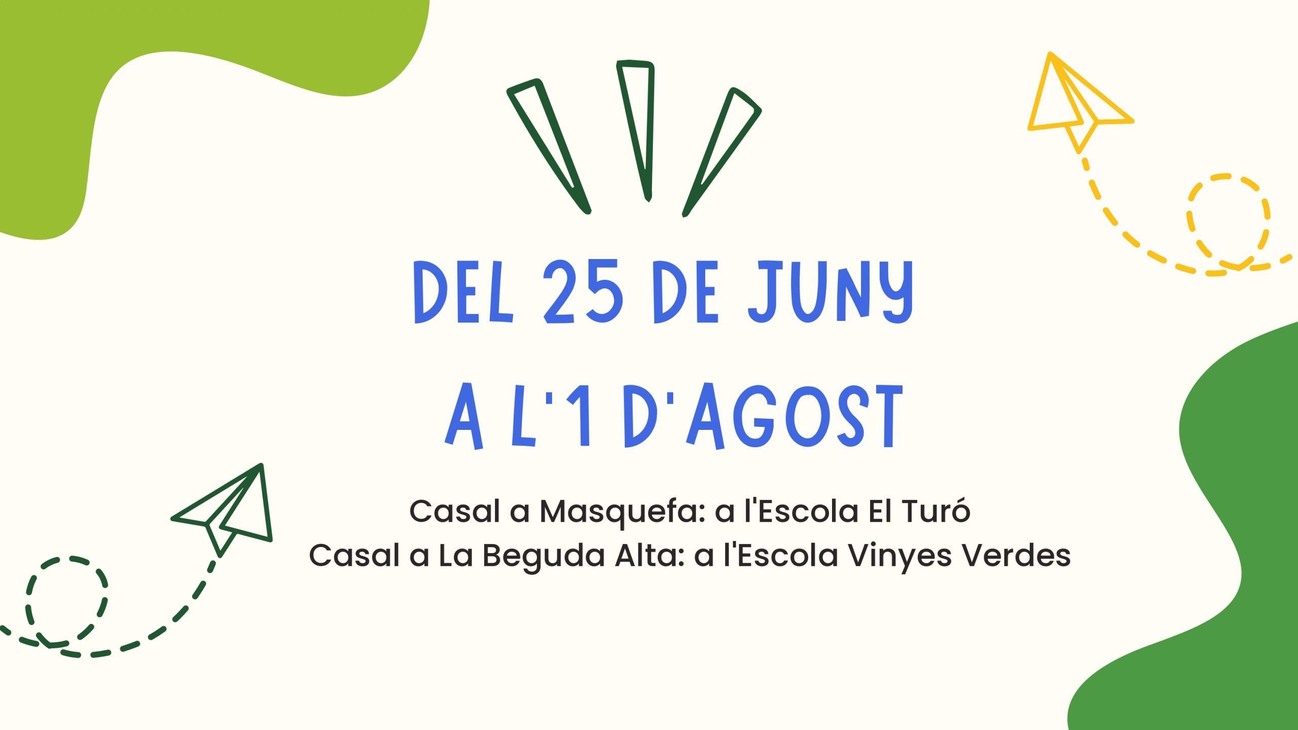 Es realitzen dos casals: un a La Beguda Alta, a l’escola Vinyes Verdes; i un altre a Masquefa, a l’escola El Turó.