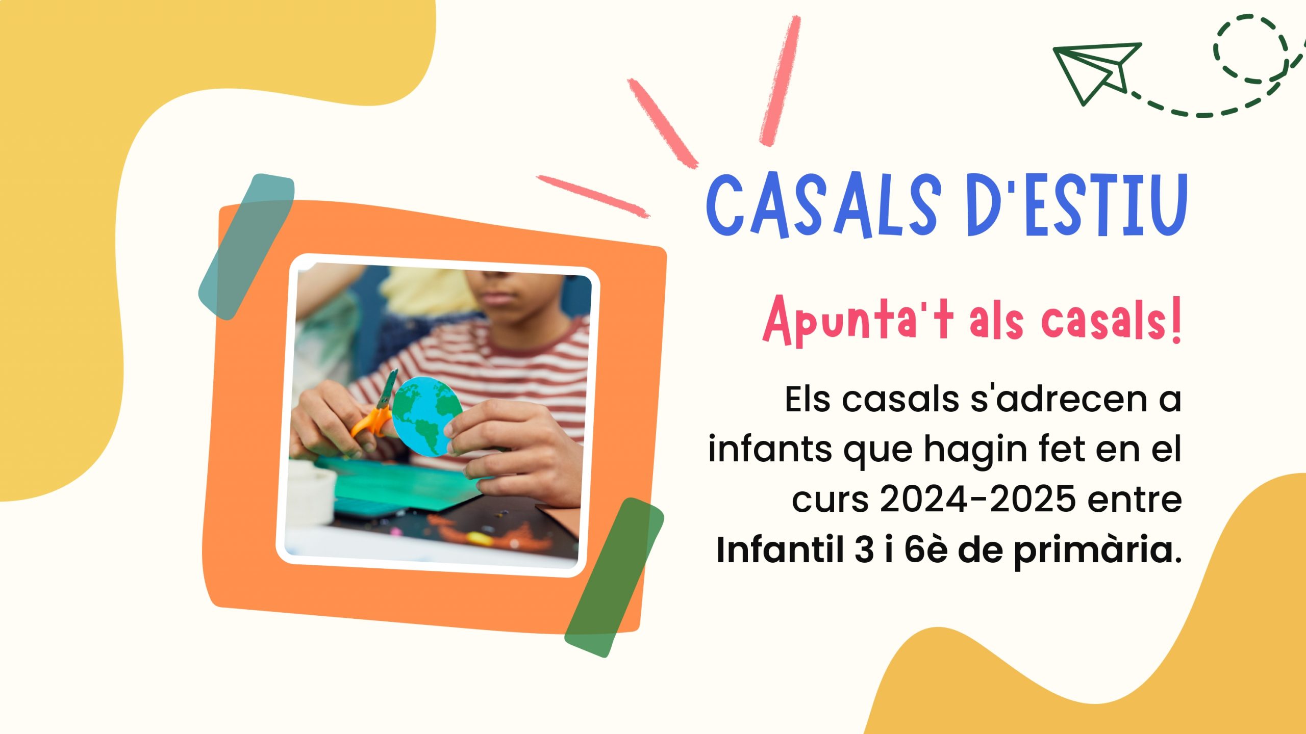 Els Casals d’Estiu promouen activitats socioeducatives adreçades als infants de 3 a 12 anys, que han cursat entre Infantil-3 i 6è de primària durant el curs escolar; i ajuden a conciliar el temps de vacances escolars dels infants amb els horaris laborals de les famílies.