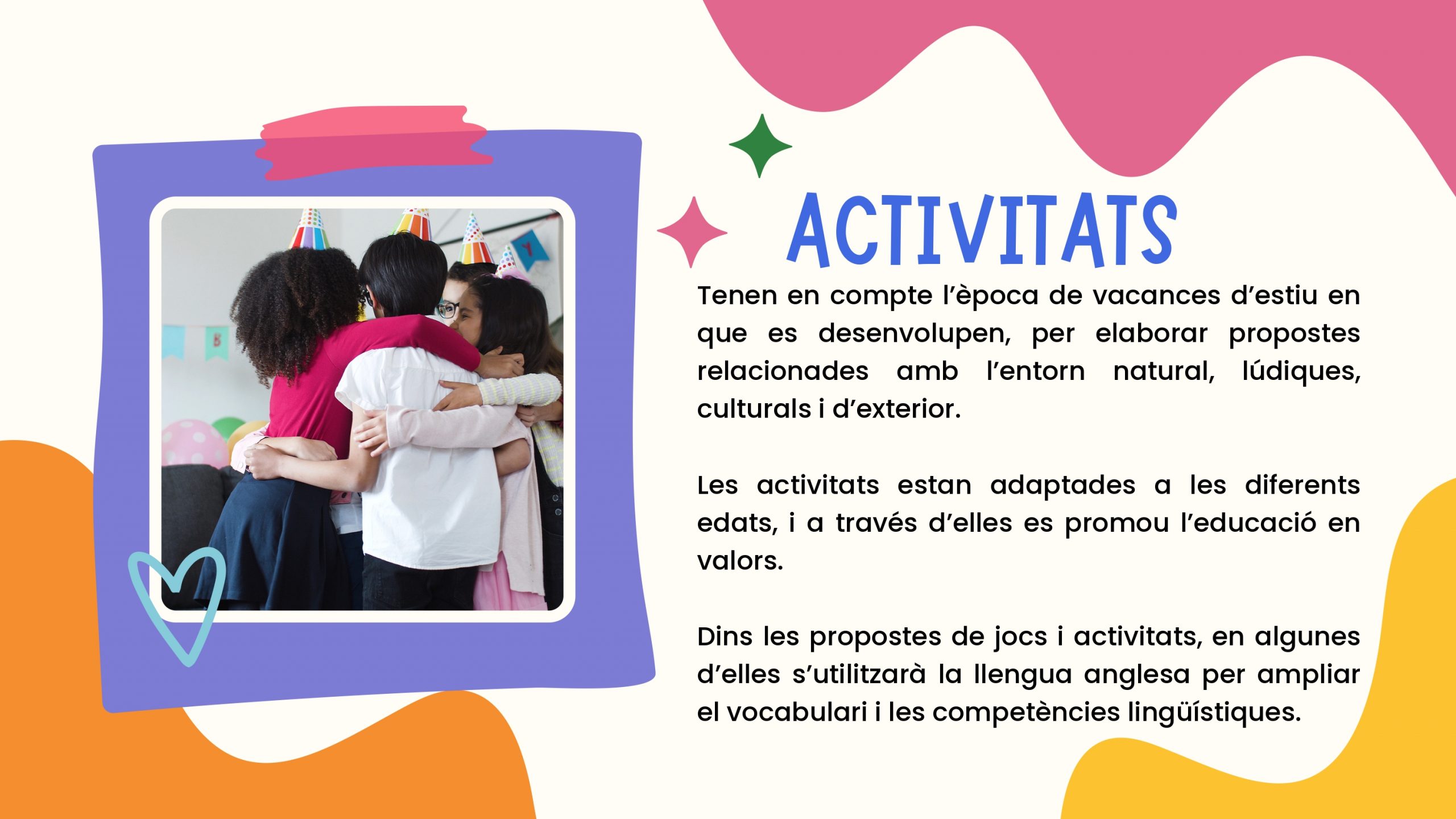 Ofereixen activitats diverses, adaptades a les diferents edats, que promouen l’educació en valors a través de la convivència i el treball en grup.