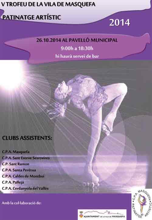 Aquest cinquè Trofeu Vila de Masquefa de Patinatge Artístic es disputarà al pavelló poliesportiu entre les 9 del matí i 2/4 de 7 de la tarda. També hi haurà servei de bar.
