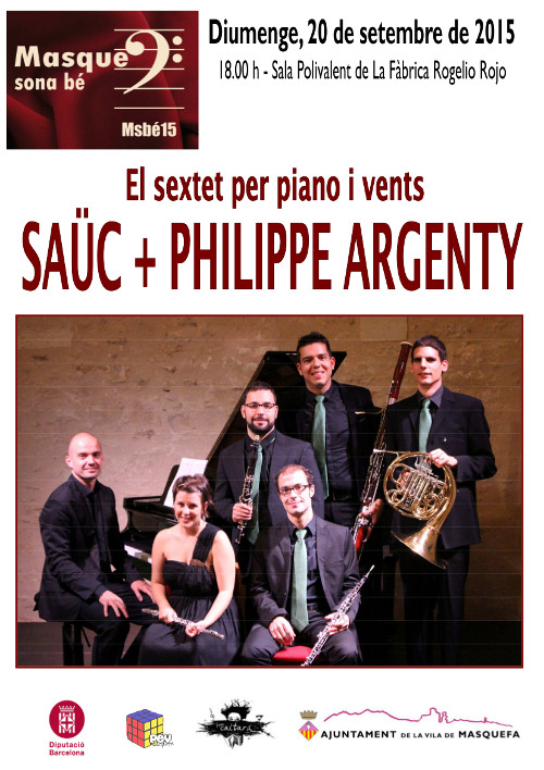 Saüc + Philippe Argenty és una formació integrada per Alejandro Ferreria (fagot), Oleguer Bertran (trompa), Pau Albert (flauta), Oriol Codina (clarinet), Enric Tudela (oboè) i Philippe Argenty (piano). En el concert a la Polivalent, ens presentaran un projecte que vol endinsar-se en les sonoritats pròpies del quintet de vent, oferint diferents obres escrites al segle XX tant per a instruments de vent com per a la seva combinació amb piano. Es tracta d’obres molt singulars per la riquesa tímbrica i diversitat de registres.