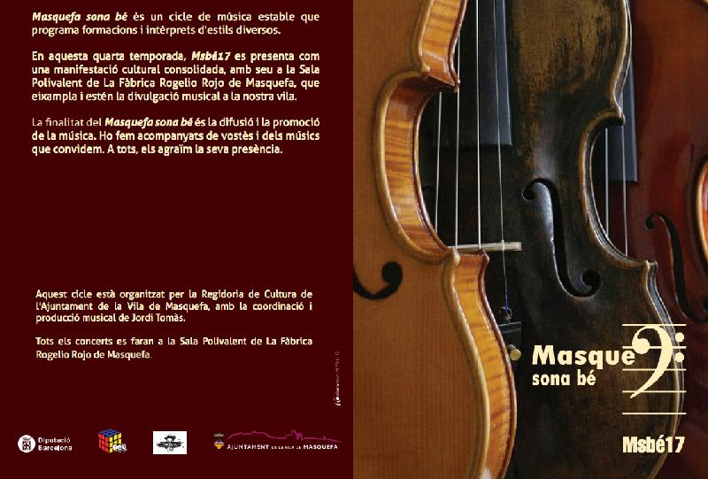 La quarta edició del ‘Masquefa sona bé’, organitzat per la Regidoria de Cultura, programa aquest 2017 fins a vuit actuacions en directe de diferents estils musicals, i amplia així l’oferta en relació a anys anteriors. La Sala Polivalent de La Fàbrica Rogelio Rojo acollirà de nou aquest projecte consolidat, que ja és un referent cultural del municipi i de la comarca de l’Anoia.