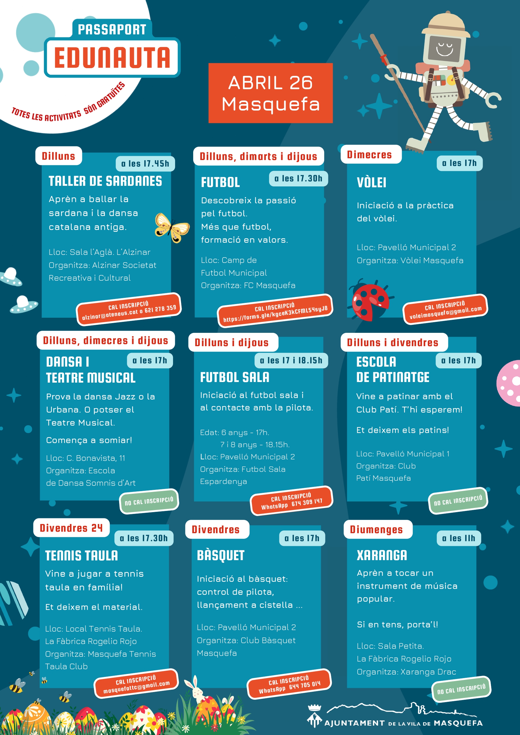 El Passaport Edunauta manté al mes d’abril una oferta àmplia i variada d’activitats a Masquefa, amb una programació que combina propostes esportives, culturals i educatives fora de l’horari lectiu. Destaca especialment una edició dedicada a Sant Jordi, amb tallers, espectacles i activitats vinculades a la lectura i la creació literària. D’aquesta manera, el programa continua consolidant-se com una eina per promoure el lleure educatiu i la participació d’infants i joves en la vida comunitària, amb la implicació d’entitats locals, escoles i equipaments municipals.