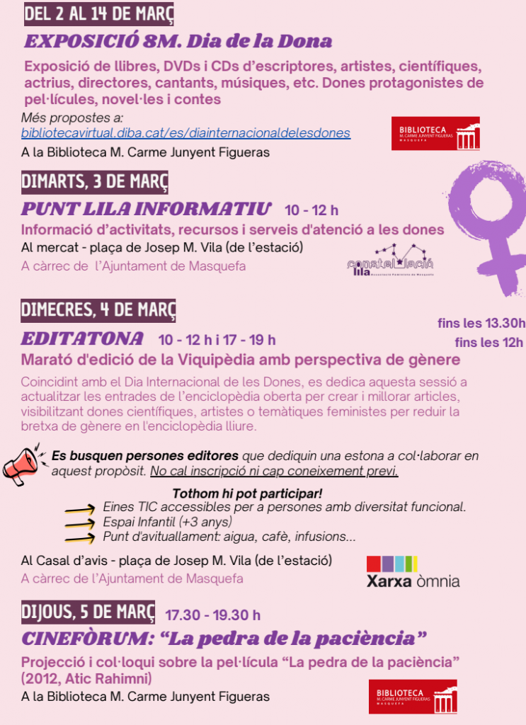La Biblioteca Maria Carme Junyent Figueras acollirà del 2 al 14 de març l’exposició ‘8M. Dia de la Dona’, amb una selecció de llibres, DVDs i CDs d’escriptores, artistes, científiques i creadores, així com obres protagonitzades per dones. Aquest equipament serà també escenari del cinefòrum de ‘La pedra de la paciència’ (5 de març), de la xerrada ‘El poder de veure’ns bé. Quan la imatge es converteix en salut!’ (6 de març), d’un conta-contes amb perspectiva de gènere (11 de març) i de la taula rodona ‘Masquefa juga per la igualtat’ (18 de març), amb esportistes locals que compartiran experiències sobre desigualtats, avenços i reptes en l’àmbit esportiu i vital.