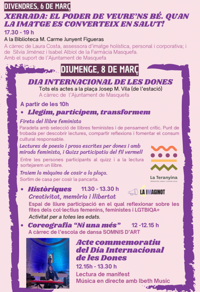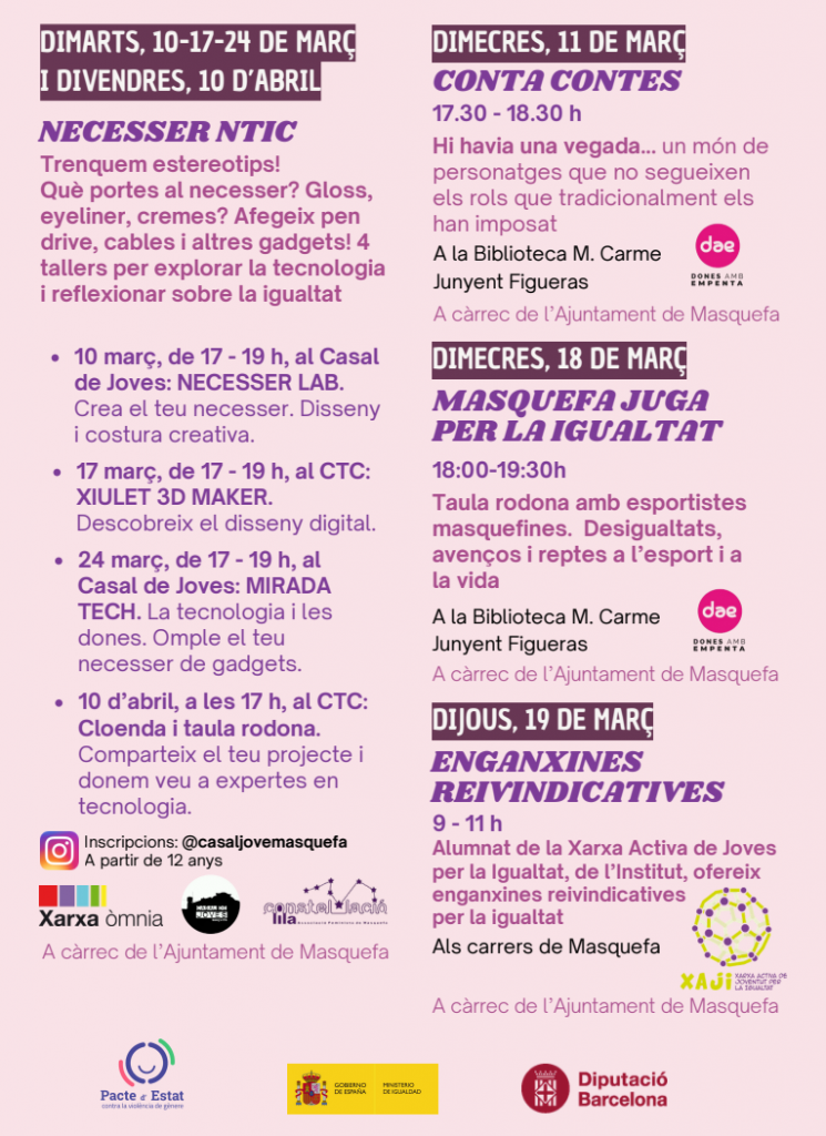 El programa es completarà amb el Punt Lila informatiu al mercat municipal (3 de març), amb la col·laboració de l’Associació Feminista Constel·lació Lila de Masquefa, per donar a conèixer recursos i serveis d’atenció a les dones, i amb l’acció d’enganxines reivindicatives impulsada per l’alumnat de la Xarxa Activa de Joves per la Igualtat (19 de març), que farà arribar missatges a favor de la igualtat pels carrers del municipi.