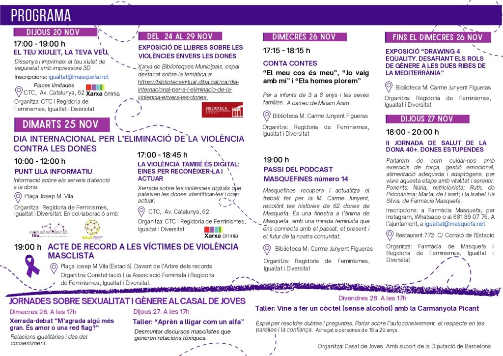 Una de les accions centrals és la campanya ‘Masquefa ha de ser lila’, que anima veïns i veïnes a penjar un llaç lila als balcons com a mostra de rebuig a la violència masclista. Els llaços es poden recollir gratuïtament a partir del 18 de novembre a l’Ajuntament, la Biblioteca i el CTC, i també el 25 de novembre al Punt Lila informatiu situat a la plaça Josep M. Vila.