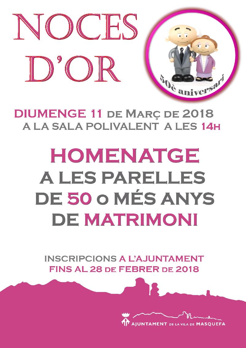 Diumenge 11 de març, l’Ajuntament retrà el tradicional homenatge a les parelles que compleixen 50 o més anys de matrimoni. L’acte té un caràcter obert i les inscripcions es poden formalitzar fins al 28 de febrer.