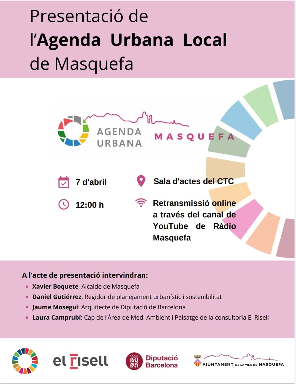 A la presentació hi intervindran l’alcalde de Masquefa, Xavier Boquete; el regidor de Planejament Urbanístic i Sostenibilitat, Daniel Gutiérrez; Jaume Moseguí, arquitecte de la Diputació de Barcelona; i Laura Camprubí, cap de l’Àrea de Medi Ambient i Paisatge de la consultoria El Risell.