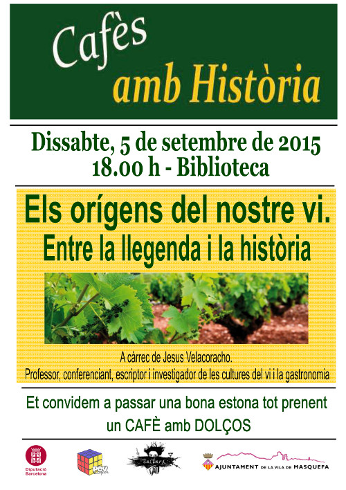 Després del parèntesi de l’estiu, el cicle de conferències i sortides Cafès amb Història es reprendrà aquest dissabte, 5 de setembre, amb la xerrada ‘Els orígens del nostre vi: entre la llegenda i la història’. La sessió es farà a la Biblioteca a les 6 de la tarda i anirà a càrrec de Jesús Velacoracho, professor, conferenciant, escriptor i investigador de les cultures del vi i la gastronomia. L’entrada és gratuïta.