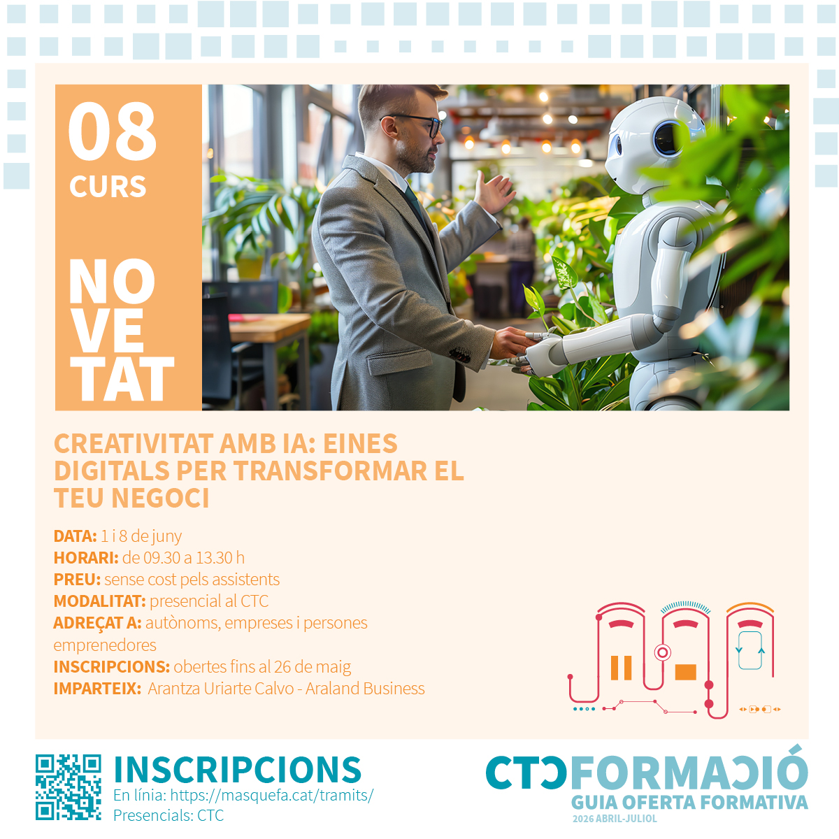 Descripció: Novetat. Aquest taller permet explorar noves formes de potenciar la creativitat aplicada al negoci combinant tècniques tradicionals amb les possibilitats de la intel·ligència artificial. Es treballarà com generar idees innovadores, desenvolupar continguts i trobar noves oportunitats de creixement. S’hi introduirà l’ús d’eines d’IA generativa com ChatGPT, Ideogram o Gemini, aplicades de manera pràctica a diferents àmbits del negoci.