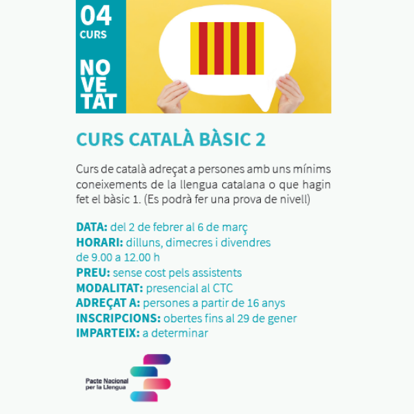 Descripció: Curs de català adreçat a persones amb uns mínims coneixements de la llengua catalana o que hagin fet el bàsic 1. (Es podrà fer una prova de nivell)