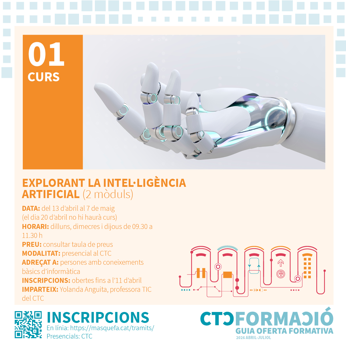 Descripció: Aquest curs introdueix les persones participants en el coneixement i l’ús pràctic de la Intel·ligència Artificial (IA) a través de diferents eines digitals. Durant la formació es presentaran recursos que permeten generar textos, imatges, idees o continguts de manera assistida, així com aplicacions que poden facilitar tasques quotidianes, d’aprenentatge o de treball.
