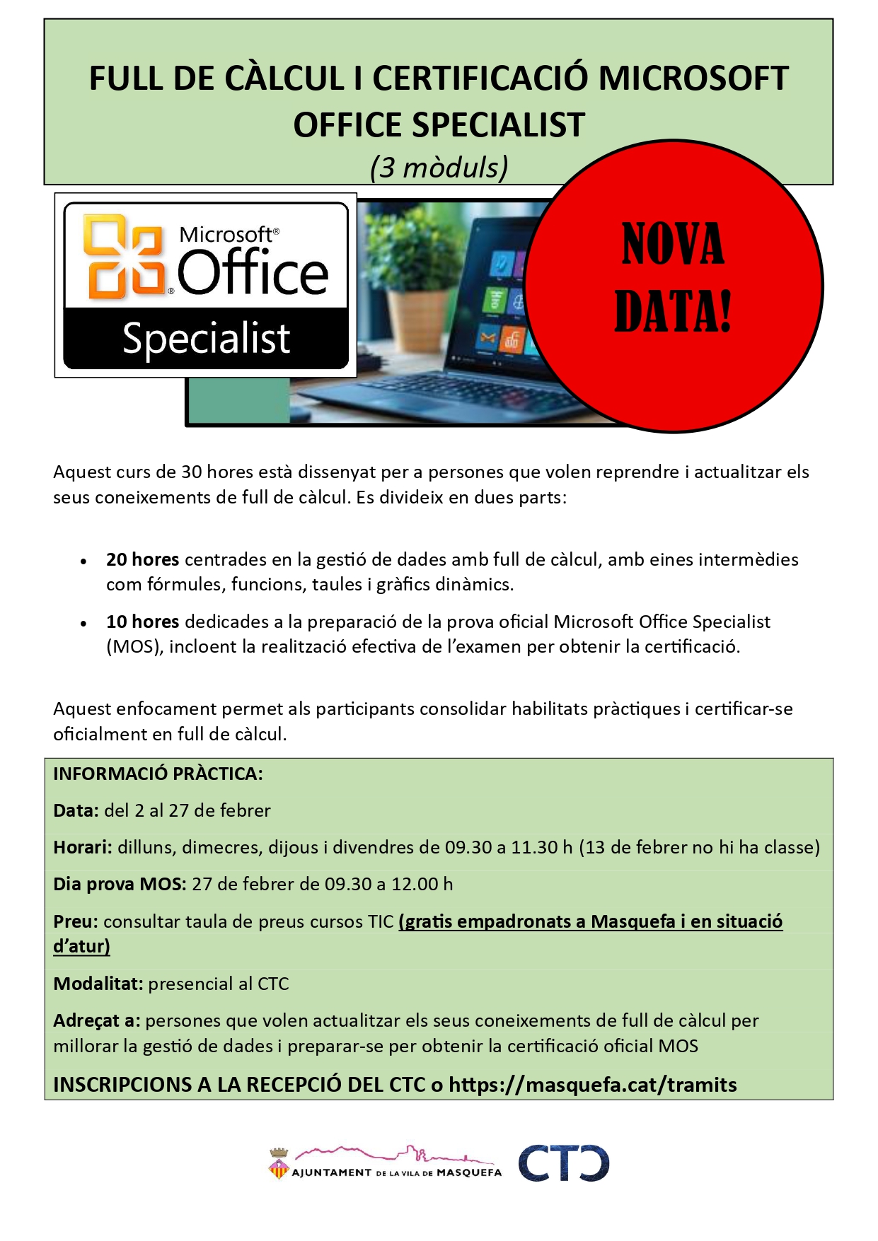 Adreçat a: persones que volen actualitzar els seus coneixements de full de càlcul per millorar la gestió de dades i preparar-se per obtenir la certificació oficial MOS
