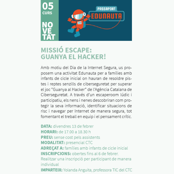 Descripció: Amb motiu del Dia de la Internet Segura, us proposem una activitat Edunauta per a famílies amb infants de cicle inicial on hauran de resoldre pistes i reptes senzills de ciberseguretat per superar el joc “Guanya al Hacker” de l’Agència Catalana de Ciberseguretat. A través d’un escaperoom lúdic i participatiu, els nens i nenes descobriran com protegir la seva informació, identificar situacions de risc i navegar per Internet de manera segura, tot fomentant el treball en equip i el pensament crític.